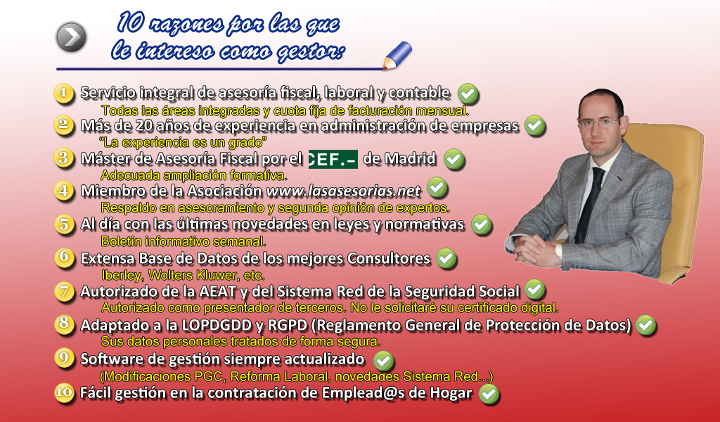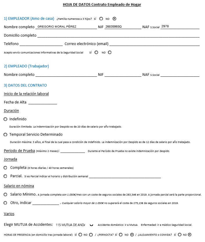 GESTIΣN ΪNICA de 150(+IVA) por Alta empleador, Alta trabajador y Contrato. Nσminas mensuales + incidencias por enfermedad o accidente = 20/mes. Al finalizar el contrato: Baja del trabajador + preaviso + finiquito = 100. SALARIO Y SEGUROS SOCIALES: A jornada completa 40h/semanales: Salario mνnimo (SMI) de 1.381,33 con cuota S.Social de 394,65*. A tiempo parcial, el salario serα la parte proporcional. Los seguros sociales, segϊn el tramo asignado en LA TABLA DE COTIZACIΣN DE EMPLEADA DE HOGAR.